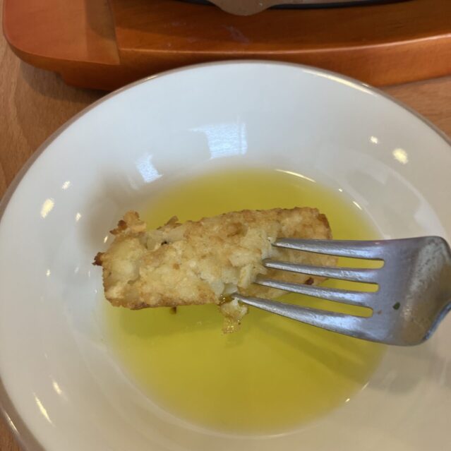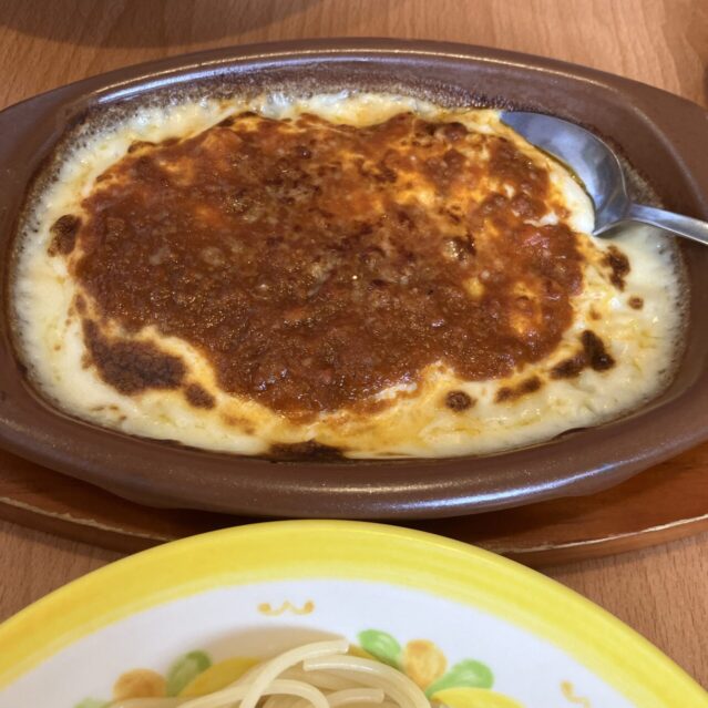 でも、これも正直な感想を言うと、なんか「みるい(柔らかい)」感じがしました。昔食べた時ってもっとチーズやホワイトソースが濃厚で、カリッとしている部分とトロッとしている部分と米の食感もしっかりしていた気がするんですが…。