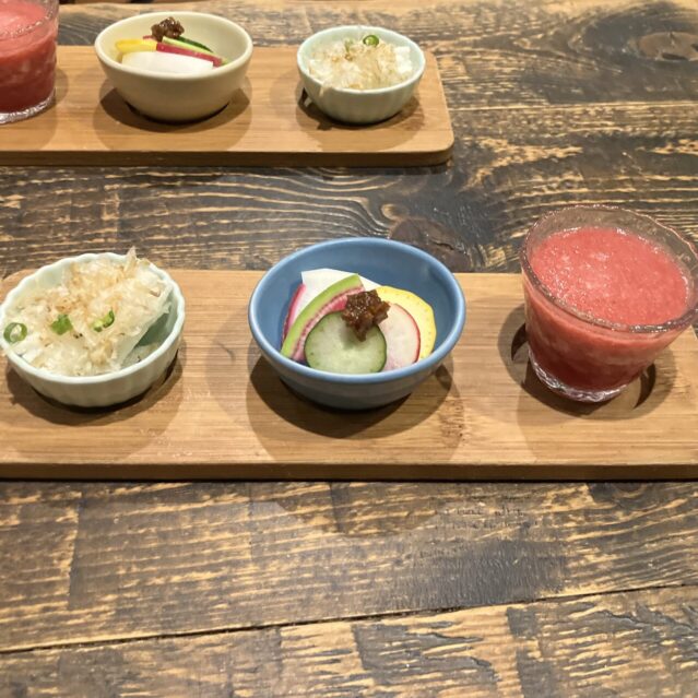 一般的な居酒屋のお通しとは一線を画していて、なんと自家製スムージーと、旬の食材を使った小鉢が2品も付いてくるんです。