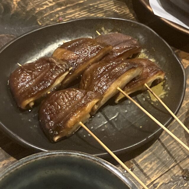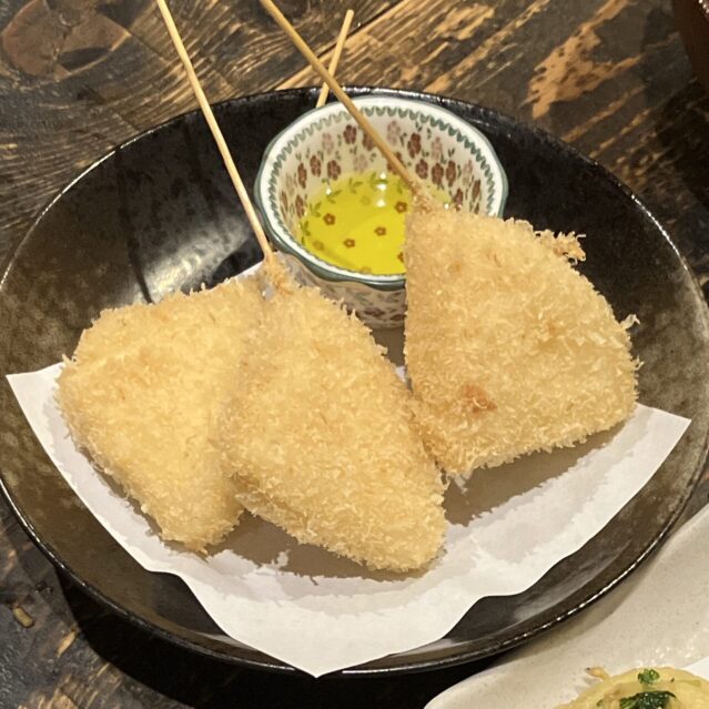 - 清水産ガルシアチーズの串揚げ:衣に米粉を使っていてサクサク!普通の串揚げより罪悪感が少ないのが嬉しいですね。清水のガルシアさんが作ったチーズもたまりません。