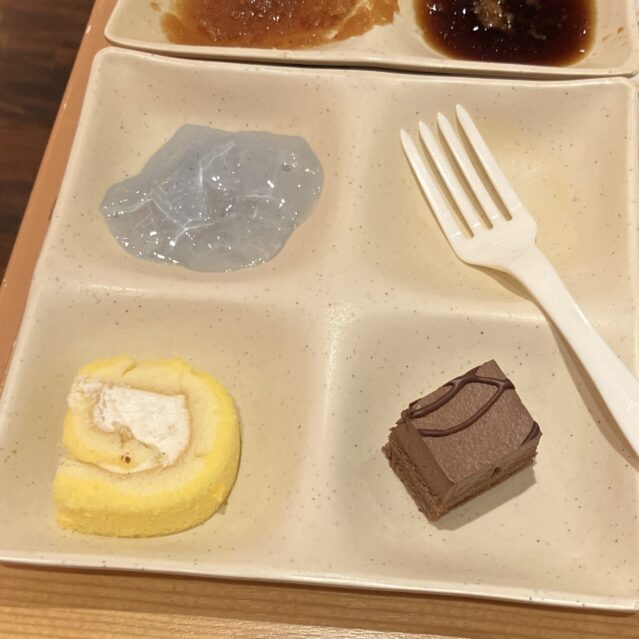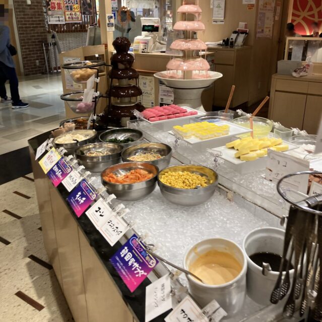 焼きそばやカレー、さらにはお茶漬けまであって、箸休めやお口直しにピッタリ。もちろんサラダもあるから、野菜不足も気にせず楽しめます、また揚げるような時間を待たずに食べれます。そして、デザートコーナー!自分でソフトクリームを巻いたり、ケーキやフルーツまであって、子供から大人までファミリー層にも大人気なのがわかる充実ぶりです!