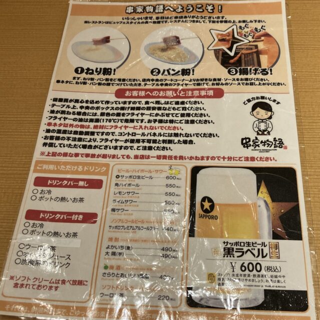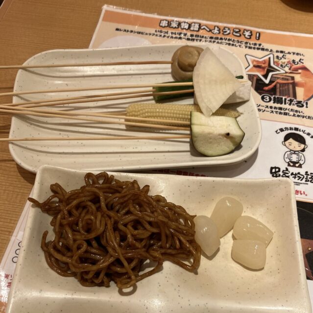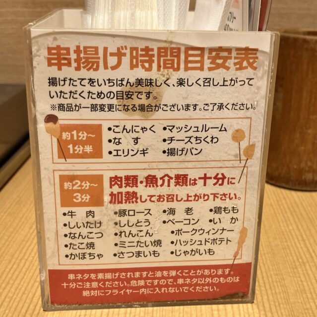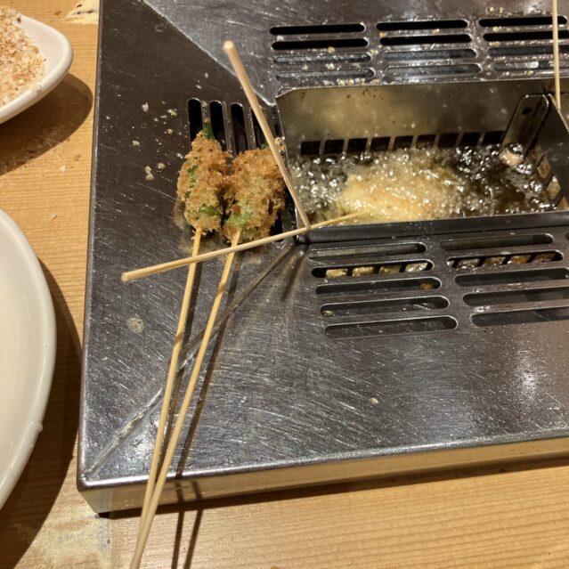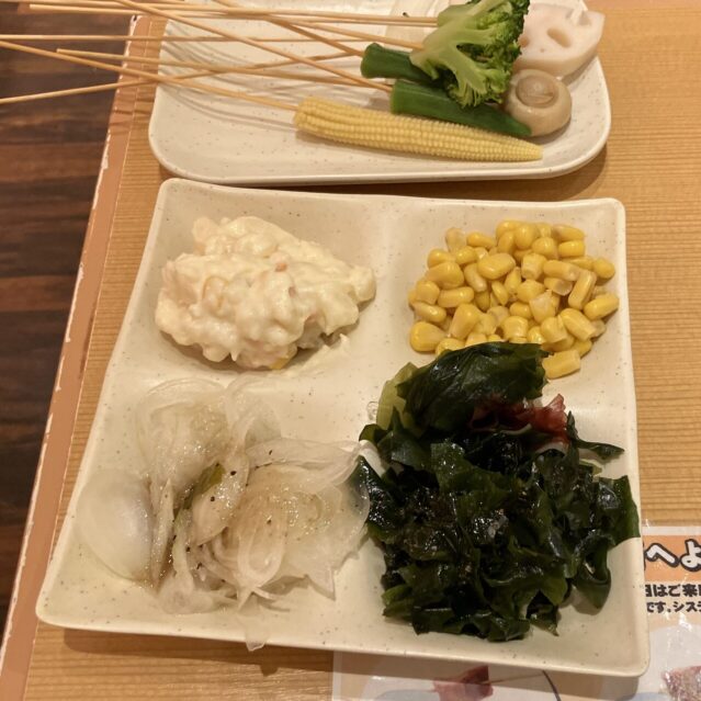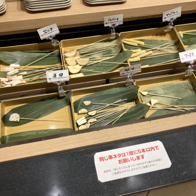 バイキング形式だから、串を取りに行く時間、自分で揚げる時間、さらに食器を下げたりする時間も含まれます。串は揚げやすいようにか、具材自体もちょっと小さめなんですよね。