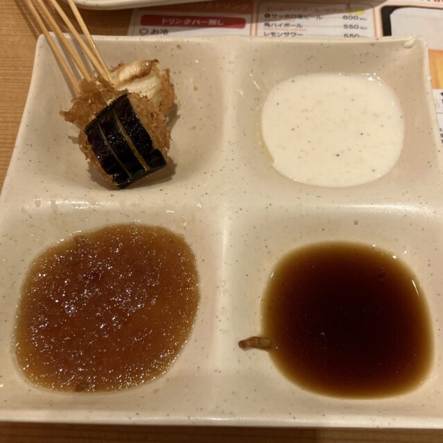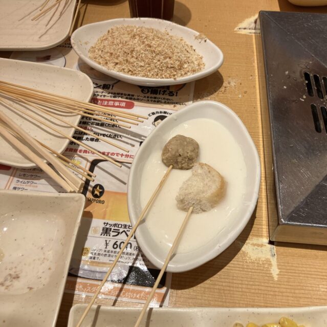 色んな串を揚げて、色んなソースを試しているうちに、口の中がどんどんソースまみれに…。喉も渇いてくるし、これは揚げ物の宿命かもしれませんね。