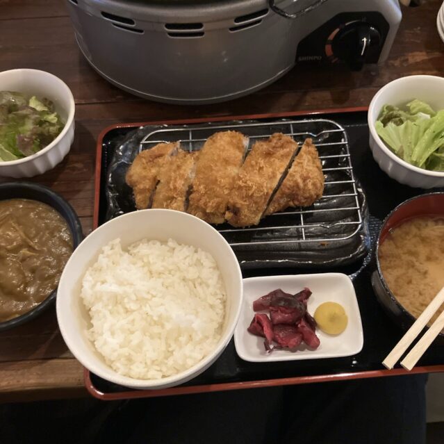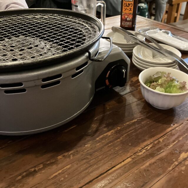 カレーメニューの横に、しっかり「焼肉定食」の文字があるんです。しかも、ただの焼肉定食じゃありません。テーブルのコンロで、自分で肉を焼くスタイルなんです!