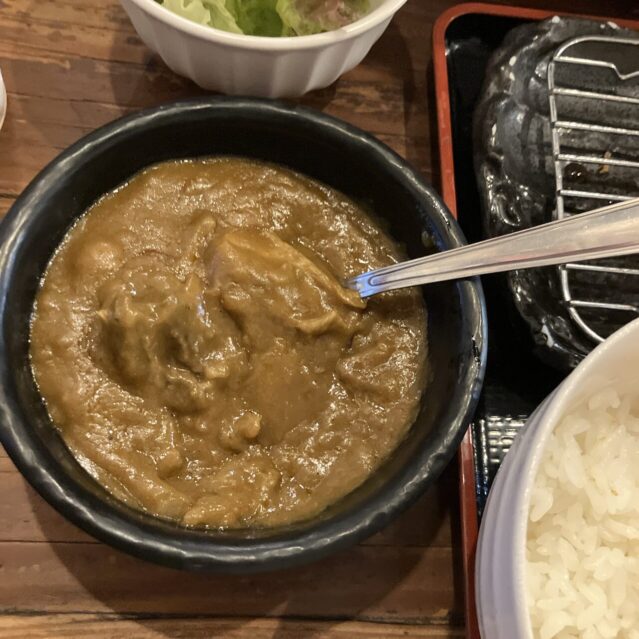 メインのミニカレーは、ルーの色が濃くて濃厚な印象。一口食べると、「あ、これは甘口ではないな、中辛くらいで俺には辛め!」とすぐにわかる、パンチの効いた辛さです。この店自慢の和牛の牛すじが溶け込んでいるようで、深いコクと旨味が感じられます。