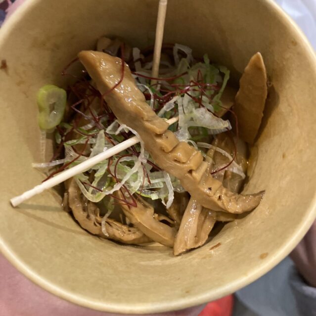 - 人気爆発!春筍ファームの「メンマ」 会場で今年も人だかりができていたのが、「春筍ファーム」さんの極太メンマ!試食させてもらいましたが、柔らかいのにシャキシャキしていて、味がしっかり染み込んでいて…もう、そのままおつまみにも最高なんです!当然購入!待ちきれず、これも会場ですぐに美味しくいただきました。