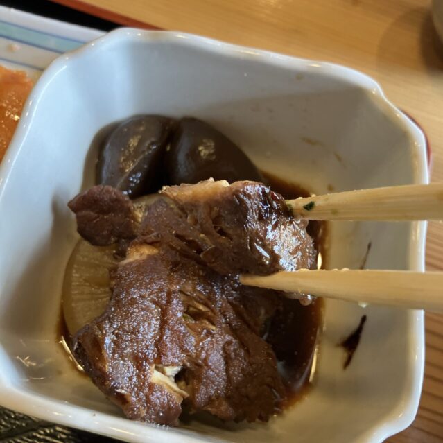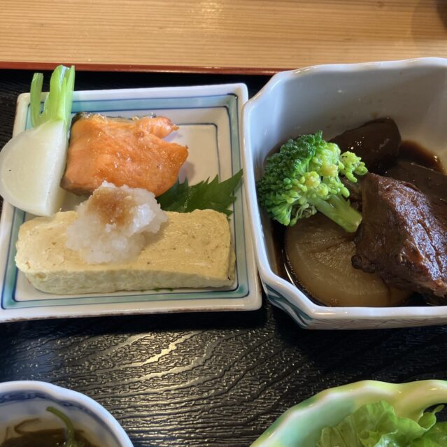 - 煮魚(ブリ大根と予想):しっかり味が染みたブリと、素材の味がしっかり残る大根が絶品。丸っこいこんにゃくも食感が良くて美味。