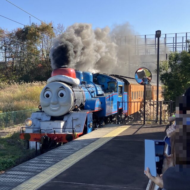 今回、おれが遭遇したのは、まさかのきかんしゃトーマス号!思っていた以上に汽笛の音が大きく、そして煙の迫力がすごい!モクモクと立ち昇る白い煙を目の前で見ると、大人でもテンション爆上がりです。