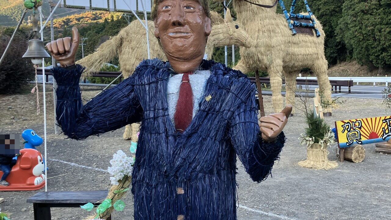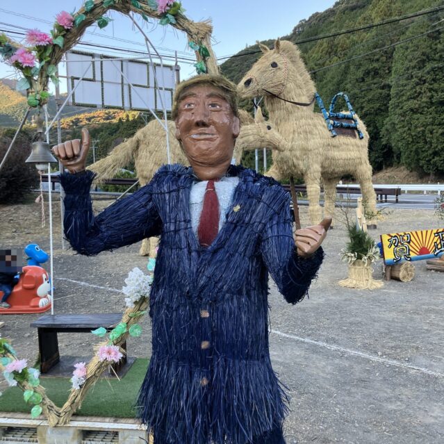 なんと、巨大な干支の近くに、まさかのトランプ大統領の藁人形(似てる笑)が立っていました!これには本当に笑ってしまいました!サプライズゲスト的なユニークな人形が飾られるのも面白いですね。