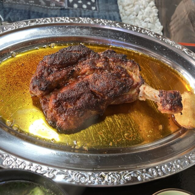 訪問は日曜12時半。ランチど真ん中の時間ですが、先客は1組のみでした。でっかい骨付鶏をナイフで切りながら食べる体験は、なかなかインパクトがあります。