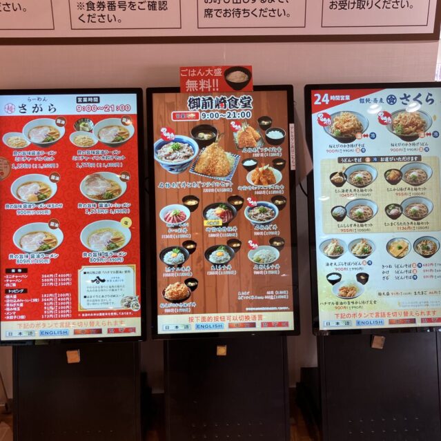 ラーメン、定食、うどんなど食事の選択肢があり、